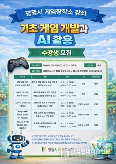 한국현대미술신문 배윤섭 기자 | 광명시 게임창작소는 오는 11일 오전 10시부터 상반기 시민 교육 프로그램인 ‘기초 게임 개발과 인공지능(AI) 활용’ 강좌의 수강생을 모집한다.