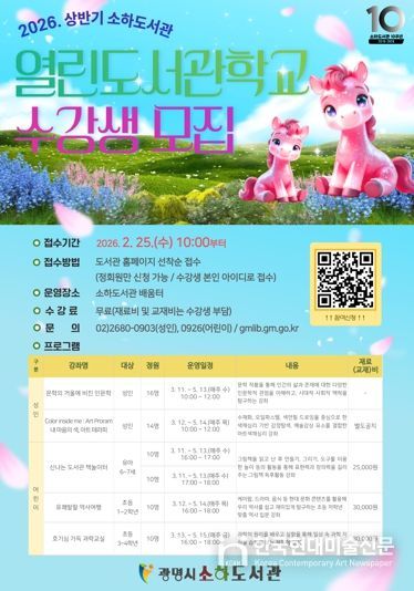 한국현대미술신문 배윤섭 기자 | 광명시 소하도서관이 ‘2026년 상반기 열린도서관학교’ 수강생을 모집한다.