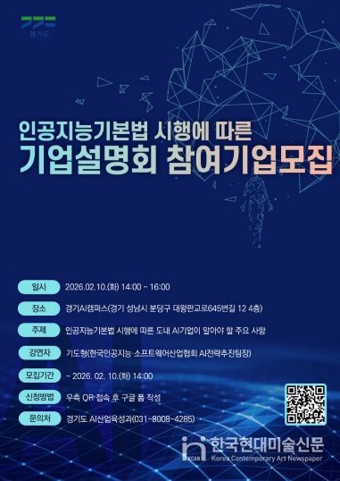 한국현대미술신문 배윤섭 기자 | 경기도가 지난 1월 22일 시행된 ‘인공지능 기본법’에 대한 도내 기업들의 이해를 돕기 위해 10일 오후 2시 판교 경기AI캠퍼스에서 AI 기업 대상 설명회를 개최한다.