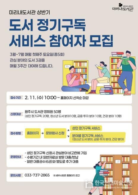 한국현대미술신문 원진 기자 | 원주시 미리내도서관은 오는 11일부터 ‘2026년 상반기 도서 정기구독 서비스’ 참여자를 모집한다.