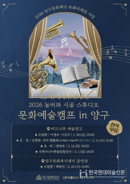 양구문화재단은 금관악기와 합창을 아우르는 릴레이 공연을 무료로 선보이며 군민들에게 다양한 문화 향유 기회를 제공할 계획이다. 공연 일정은 ▲2월 12일 오후 7시 ‘맹영욱(튜바) 팀 콘서트’(버드나무 예술창고) ▲2월 25일 오후 3시 ‘백향민(트럼펫) 팀 콘서트’(양구문화복지센터) ▲3월 1일 오후 2시 ‘진짜 사나이 한울림 합창단 공연’(버드나무 예술창고)이다.