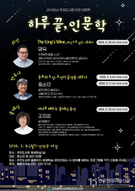 한국현대미술신문 박재남 기자 | 인천광역시교육청주안도서관은 2월부터 3월까지 시민들이 다양한 인문학 주제를 접할 수 있는 야간 인문학 프로그램 ‘하루 끝, 인문학’을 운영한다.