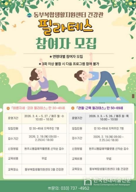 한국현대미술신문 원진 기자 | 원주시 동부복합생활지원센터 건강관은 오는 19일부터 중·장년을 대상으로 한 필라테스 프로그램 참여자를 모집한다.