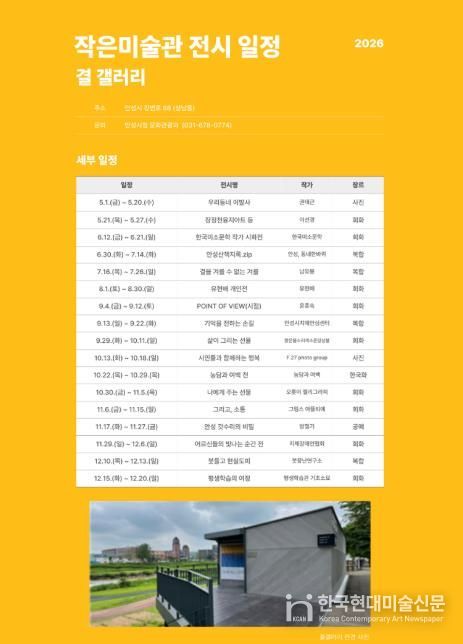 한국현대미술신문 배윤섭 기자 | 안성시는 2월 9일 ‘안성시 작은미술관(결갤러리, 시옷갤러리) 전시 공모’ 심사 결과를 발표하고, 총 31개의 전시를 최종 선정했다고 밝혔다.