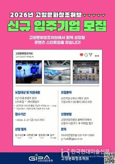 한국현대미술신문 배윤섭 기자 | 고양특례시와 고양산업진흥원이 오는 27일 오후 3시까지 고양문화창조허브 신규 입주기업을 모집한다.