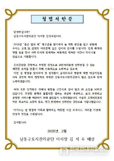 한국현대미술신문 박재남 기자 | 인천시 남동구 도시관리공단은 청렴 문화 정착을 위해 공사, 용역, 물품 관련 업체와 전 직원에게 ‘청렴 서한문’을 발송했다고 11일 전했다.
