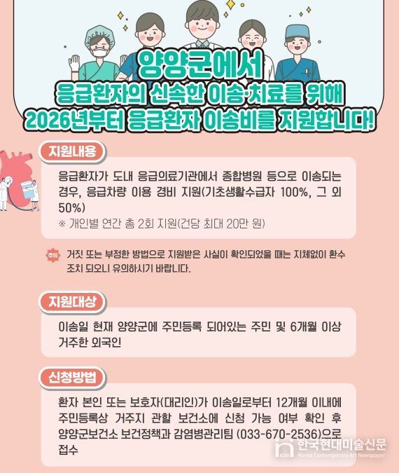 한국현대미술신문 원진 기자 | 양양군이 응급환자의 신속한 이송과 치료, 의료 사각지대 해소를 위해 응급환자 이송비 지원사업을 올해도 지속 추진한다.