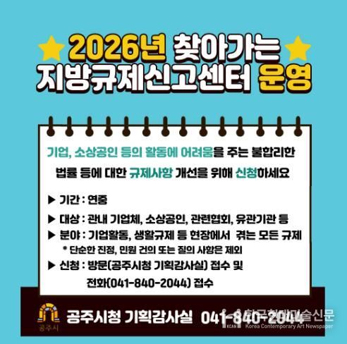 한국현대미술신문 신정은 기자 | 공주시는 2월부터 ‘찾아가는 지방규제 신고센터’를 연중 운영한다고 밝혔다.