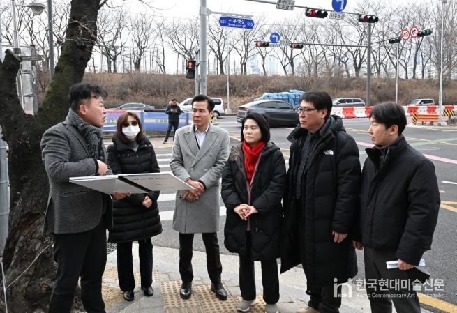 한국현대미술신문 배윤섭 기자 | 서울특별시의회 시민권익위원회 위원으로 활동하고 있는 박춘선 의원(강동3, 국민의힘)이 2월 10일 교통정체로 시민 불편이 지속되고 있는 가산한내보도육교 앞 교차로를 직접 찾아 현장 점검을 실시했다. 현장에는 서울특별시의회 현장민원과와 서부간선도로 주관 부서인 서울시 도로계획과, 도시기반시설본부 관계자가 함께 했다.