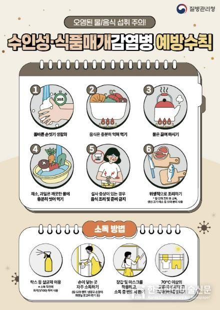 또한 연휴 기간 음식 관리가 소홀해질 경우 수인성·식품매개감염병이 발생할 수 있다. 특히 겨울철에 많이 발생하는 노로바이러스 감염증 환자가 높은 수준을 보이고 있어 각별한 주의가 필요하다. 노로바이러스는 사람 간 전파가 가능하므로 귀가 후와 식사 전에는 30초 이상 비누로 손을 씻고, 음식은 흐르는 물에 세척한 뒤 85℃ 이상에서 1분 이상 충분히 익혀 먹어야 한다. 해외여행 시에도 오염된 식수와 음식 섭취로 세균성 이질, 콜레라 등에 감염될 수 있어 주의해야 한다.