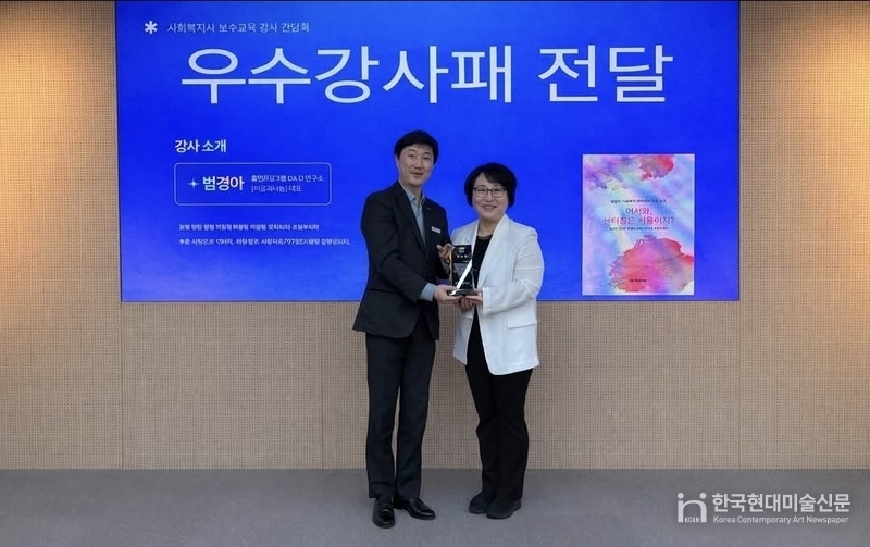 한국현대미술신문 김미정 기자 | 이음과나눔 범경아 대표가 지난 2월 10일(화) 열린 경기도사회복지사협회(회장 박찬수) 보수교육 강사간담회에서 ‘2025년 우수강사패’를 수상했다.