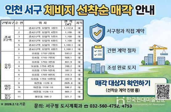 한국현대미술신문 박재남 기자 | 인천 서구는 도시개발구역·구획정리사업지구 내 체비지 잔여 물량 17필지를 선착순 수의계약 방식으로 매각한다고 밝혔다.