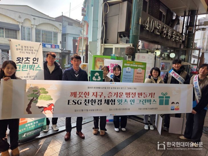 한국현대미술신문 박재남 기자 | 인천중구시설관리공단은 공단 임직원들이 설을 앞두고 지난 11일 신포국제시장에서 지역 주민들을 대상으로 생활 속 올바른 분리배출 실천을 유도하기 위한 체험형 친환경 행사 ‘왓츠 인 그린박스’를 진행했다고 밝혔다.