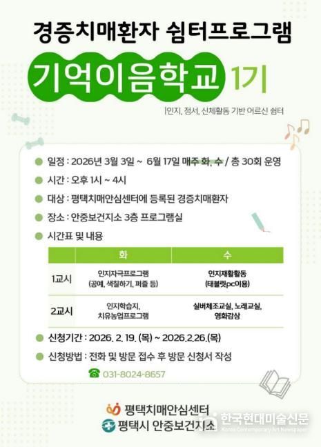 한국현대미술신문 배윤섭 기자 | 평택시 안중보건지소는 경증 치매 환자의 인지기능 유지와 일상생활 지원을 위해 오는 3월 3일부터 6월 17일까지 경증 치매 환자 쉼터 프로그램 ‘기억이음학교 1기’를 운영한다.