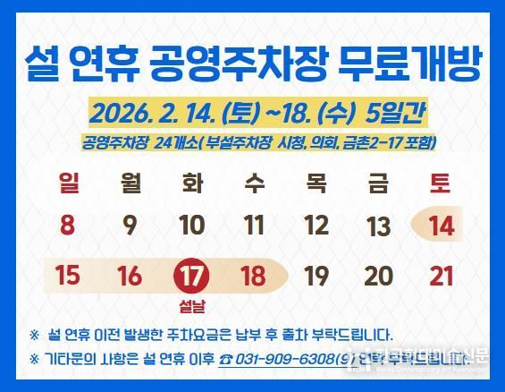 한국현대미술신문 배윤섭 기자 | 파주도시관광공사는 12일, 2026년 설 명절을 맞아 시민과 고향을 방문하는 귀성객의 교통편의를 위해 공영주차장 24곳(부설주차장 시청, 의회, 금촌2-17 포함)을 오는 14일(토)부터 18일(수)까지 5일간 무료로 개방한다고 밝혔다.