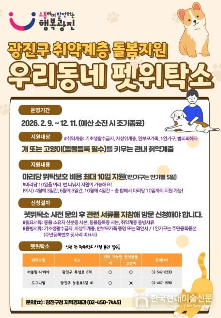 한국현대미술신문 배건 기자 | 광진구가 갑작스러운 상황으로 인해 반려동물 임시보호가 필요한 취약계층을 위해 ‘우리동네 펫위탁소’를 운영한다.