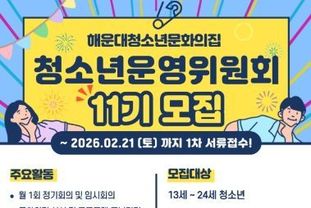 한국현대미술신문 정소영 기자 | 해운대청소년문화의집이 지역 청소년의 참여 확대를 위해 ‘청소년운영위원회 11기 청바라기’를 공개 모집한다. 모집 대상은 해운대구에 거주하거나 관내 학교에 재학 중인 13세부터 24세 이하 청소년이며, 접수는 이달 21일까지 진행된다.