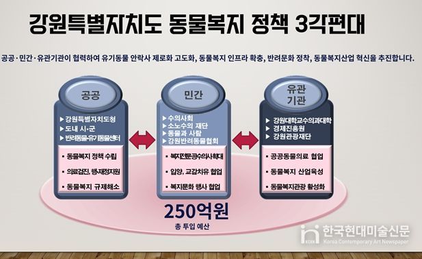 한국현대미술신문 원진 기자 | 강원특별자치도는 2월 20일 오후 2시 강릉에 위치한 도 반려동물지원센터에서 ‘강원형 동물복지 정책’을 발표하고, 복지‧의료‧산업‧관광을 아우르는 4대 전략을 본격 추진한다고 밝혔다.
