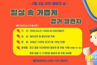 참가자는 20일간 누적 15만 보 걷기(1일 최대 8천 보)를 목표로 일상 속 걷기를 실천하게 되며, 목표 달성자 중 추첨을 통해 기념품을 제공한다. 또한 최고 걸음수(20만 보) 달성자 중 10명을 별도 선정하는 ‘최고걸음상’을 수여해 참여 동기를 한층 높일 계획이다.