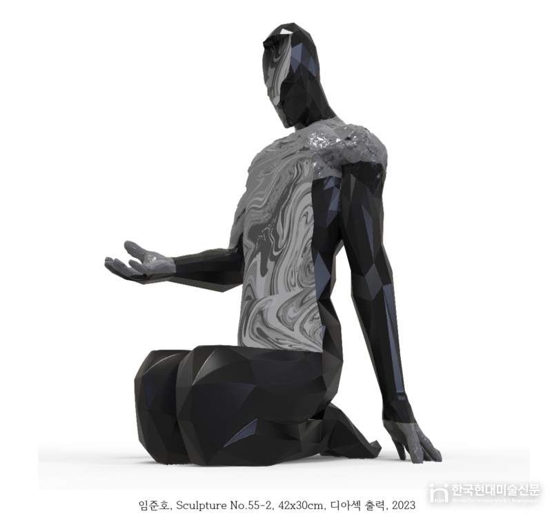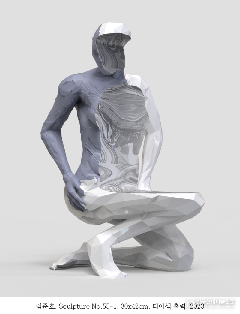 임준호 작가는 3D 모델링과 디지털 프린팅을 활용해 조각의 전통적 개념을 확장한다. 기하학적으로 분절된 인체 형상 위에 유기적인 질감을 입히며, 물질과 비물질의 경계를 실험한다.