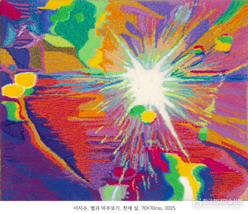이지수 작가는 천과 실을 활용해 기억과 감정의 결을 시각화한다. 화면 위에 촘촘히 쌓인 색실과 질감은 우울, 상실, 회복의 시간을 상징적으로 담아낸다.