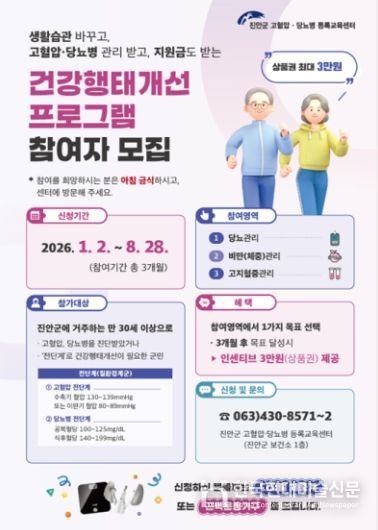 센터 관계자는 “고혈압과 당뇨병은 꾸준한 관리가 무엇보다도 중요하다”며 이번 프로그램이 주민들의 혈압·혈당 조절률 향상과 합병증 예방에 도움이 되길 기대한다며, 자세한 사항은 진안군 고혈압·당뇨병 등록교육센터로 문의하면 된다.