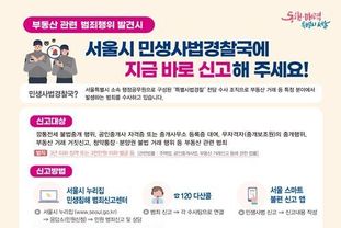 서울시(민생사법경찰국)는 부동산 시장 왜곡을 막고 무주택 시민의 피해를 예방하기 위해 인위적인 집값 담합, 허위거래 신고 등 부동산 거래 질서를 교란하는 행위에 대한 집중 수사에 들어간다고 밝혔다.