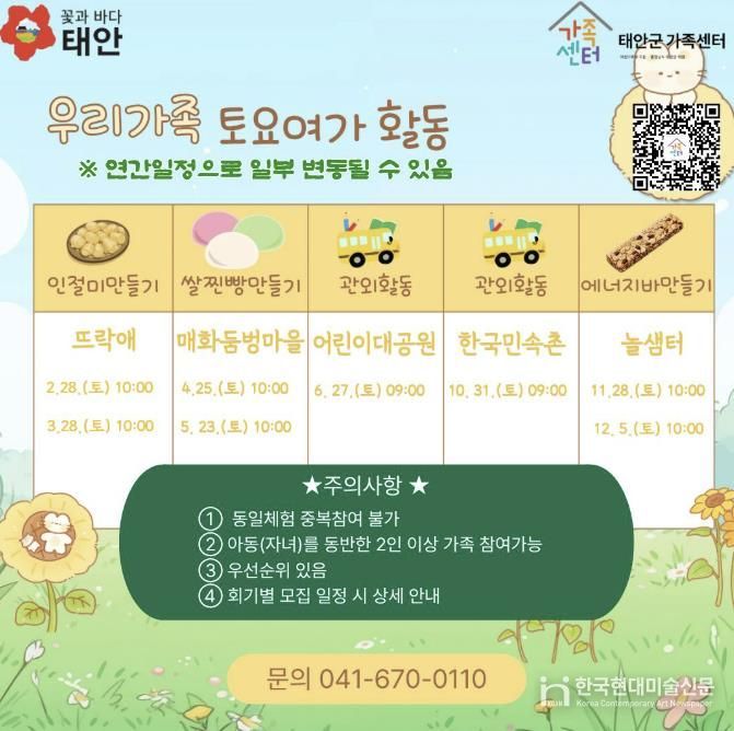 한국현대미술신문 신정은 기자 | 태안군가족센터가 자녀와 부모가 함께 소통하며 즐거운 주말을 보낼 수 있는 ‘우리가족 토요여가 활동’ 프로그램을 운영한다.