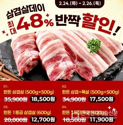 이어 2월 24일부터 26일까지는 ‘삼겹살데이 맞이 반짝 할인전’이 열린다. 온충북에 입점한 고품질 한돈 삼겹살과 목살을 특별 할인가에 선보이며, 고기와 함께 곁을여 먹기 좋은 버섯, 상추 등 쌈채소류도 동시에 할인 판매해 소비자들이 한 번에 다양한 상품을 편리하게 구매할 수 있도록 기획했다.