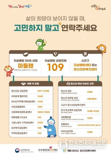 한편, 정신적 어려움과 위기 상황에 놓인 시민은 계룡시 보건소 또는 24시간 자살예방 상담전화를 통해 도움을 받을 수 있다.