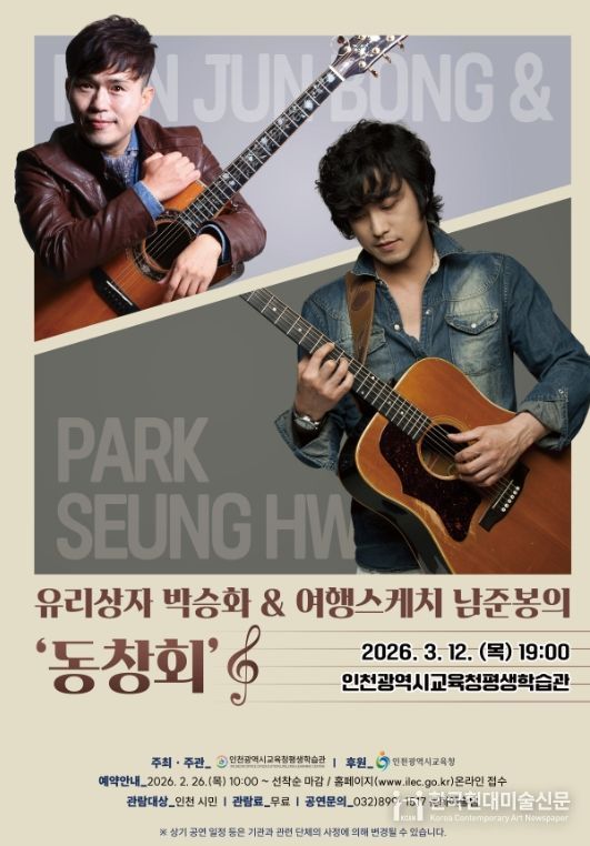 한국현대미술신문 박재남 기자 | 인천광역시교육청평생학습관은 시민의 다양한 문화예술 향유를 위하여, 3월 12일 교육누리홀에서 ‘유리상자 박승화 & 여행스케치 남준봉’ 음악 공연을 개최한다.