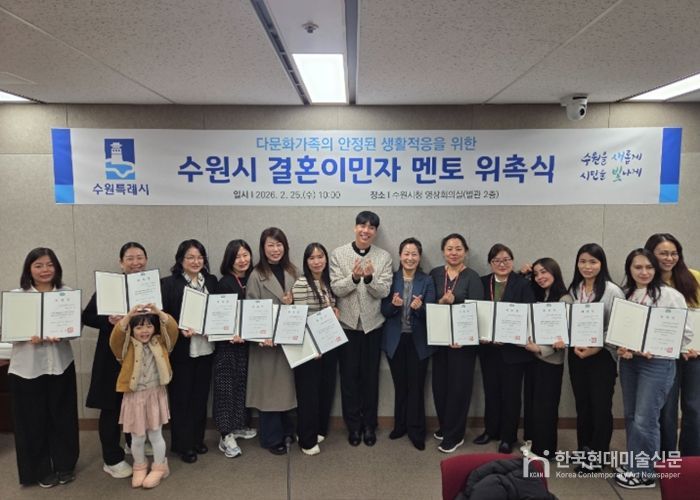 한국현대미술신문 배윤섭 기자 | 수원특례시가 25일 시청 영상회의실에서 ‘2026년 결혼이민자 멘토 위촉식’을 열고 선배 이민자 멘토 15명을 위촉했다.