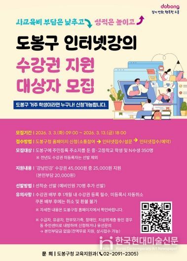 한국현대미술신문 배건 기자 | 서울 도봉구(구청장 오언석)가 ‘2026년 인터넷강의 수강권 지원사업’ 대상자를 모집한다.