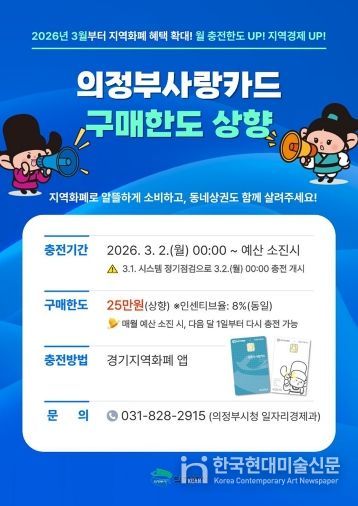 한국현대미술신문 배윤섭 기자 | 의정부시는 지역경제 활성화와 민생 안정을 위해 3월부터 의정부사랑카드(지역화폐) 월 구매 한도를 기존 15만 원에서 25만 원으로 상향한다.