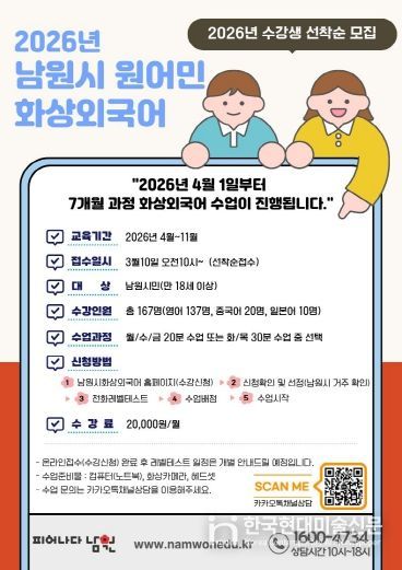 한국현대미술신문 기자 | 남원시가 시민들의 어학 실력 향상과 글로벌 역량 강화를 위해 오는 3월 10일부터 ‘2026년 원어민 1:1 화상외국어 교육’ 수강생을 선착순으로 모집한다.
