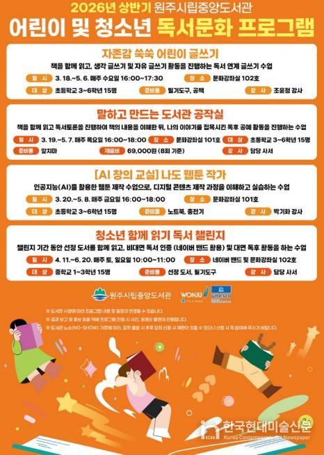 한국현대미술신문 원진 기자 | 원주시립중앙도서관은 오는 3월부터 6월까지 ‘2026년 상반기 어린이 및 청소년 독서문화 프로그램’을 운영한다.