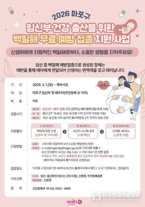 한국현대미술신문 배건 기자 | 마포구는 3월 1일부터 지역 내 출산을 앞둔 예비부모를 대상으로 백일해 무료 예방접종을 지원한다.