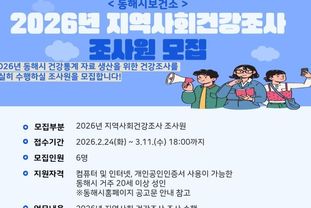 한국현대미술신문 원진 기자 | 동해시는 질병관리청, 연세대학교 원주의과대학과 함께 수행하는 ‘2026년 지역사회 건강조사’에 참여할 조사원 6명을 모집한다고 밝혔다.