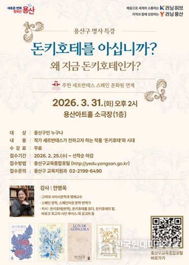 이번 특강은 이상과 현실 사이에서 끊임없이 질문하는 돈키호테의 모습을 통해, 급변하는 시대 속에서 우리가 지켜야 할 가치와 삶의 방향을 성찰하는 자리로 기획됐다. 강연 후에는 질의응답과 사인회도 진행해 참여형 인문 강좌로 운영한다. 특강은 3월 31일 오후 2시 용산아트홀 소극장에서 열리며, 용산구민 누구나 무료로 참여할 수 있다.