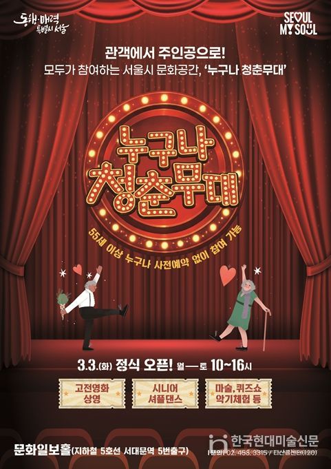 한국현대미술신문 배건 기자 | 서울시는 어르신들이 편하고 즐겁게 머물 수 있는 문화쉼터 ‘누구나 청춘무대’를 3일부터 정식 운영한다고 밝혔다. ‘누구나 청춘무대’는 55세 이상 어르신이면 누구나 무료로 공연과 영화를 관람하고 다양한 체험 프로그램에 참여할 수 있는 열린 문화공간이다.