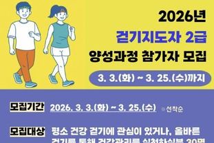 보건소 관계자는 “2025년 지역사회건강통계에 따르면 예산군의 걷기 실천율은 47.5%로, 충남(51.3%) 및 전국 평균(49.2%)보다 낮은 수준”이라며 “걷기 지도자 양성과 다양한 프로그램 운영을 통해 걷기 실천율을 높이고 군민 건강증진에 기여하겠다”고 밝혔다.