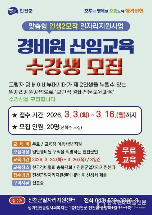 한국현대미술신문 신정은 기자 | 충북 진천군은 은퇴 전·후 중장년층의 안정적인 재취업을 지원하기 위해 ‘2026년 맞춤형 인생 2모작 일자리 사업’의 하나로 ‘경비원 신임교육’ 수강생을 모집한다.