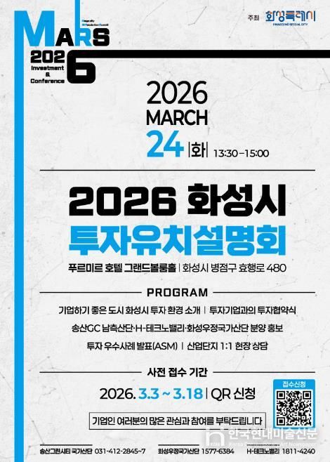 한국현대미술신문 배윤섭 기자 | 화성특례시가 오는 3월 24일 푸르미르 호텔에서 ‘2026 화성특례시 투자유치 설명회’를 개최하고, 3월 3일부터 3월 18일까지 QR코드를 통한 사전접수를 진행한다.