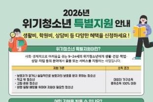 한국현대미술신문 정소영 기자 | 대구 북구청은 오는 3월 16일부터 3월 27일까지 위기청소년들의 건강한 성장을 돕기 위한‘2026년 위기청소년 특별지원 사업’ 대상자를 모집한다.
