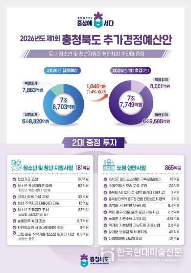 한국현대미술신문 신정은 기자 | 충북도는 도민 체감형 위주의 사업 지원 및 상반기 추진이 시급한 역점사업 추진을 위해 1,046억원 규모의 제1회 추가경정예산안을 3월 3일 충청북도의회에 제출했다.