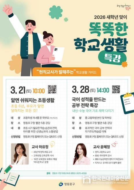 한국현대미술신문 배건 기자 | 영등포구가 새 학년을 맞아 초‧중‧고등학생과 학부모를 대상으로 ‘똑똑한 학교생활 특강’을 운영한다. 학생들의 원활한 학교 적응과 효과적인 학습 준비를 돕기 위해 마련된 프로그램이다.