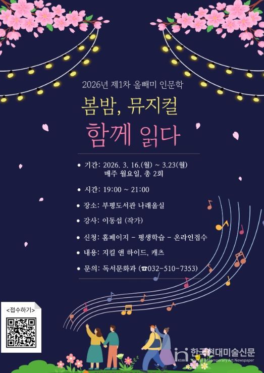 한국현대미술신문 박재남 기자 | 인천광역시교육청부평도서관은 5일부터 2026년 제1차 올빼미 인문학 강연 ‘봄밤, 뮤지컬 함께 읽다’ 참여자를 모집한다.