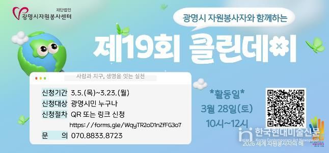한국현대미술신문 배윤섭 기자 | 광명시자원봉사센터는 오는 3월 28일 자원봉사 단체․활동처 및 광명 시민이 함께 광명시 전역에서 환경정화 활동을 펼치는‘제19회 광명시 자원봉사자와 함께하는 클린데이’를 진행한다고 밝혔다.