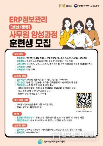 한국현대미술신문 배윤섭 기자 | 김포여성새로일하기센터는 지역 산업 수요에 부합하는 전문 인력 양성과 경력보유 여성의 안정적인 취업 지원을 위해 '전사적 자원관리(ERP) 생산·물류 사무원 양성 과정' 훈련생을 모집한다.