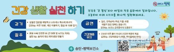 한국현대미술신문 배윤섭 기자 | 평택시 송탄보건소는 시민을 대상으로 걷기(신체 활동)·금연·절주·건강 체중 유지로 구성된 ‘4가지 건강생활습관 실천’ 수칙을 안내하며, 일상에서 작은 습관부터 실천해 건강을 지켜나갈 것을 당부했다.